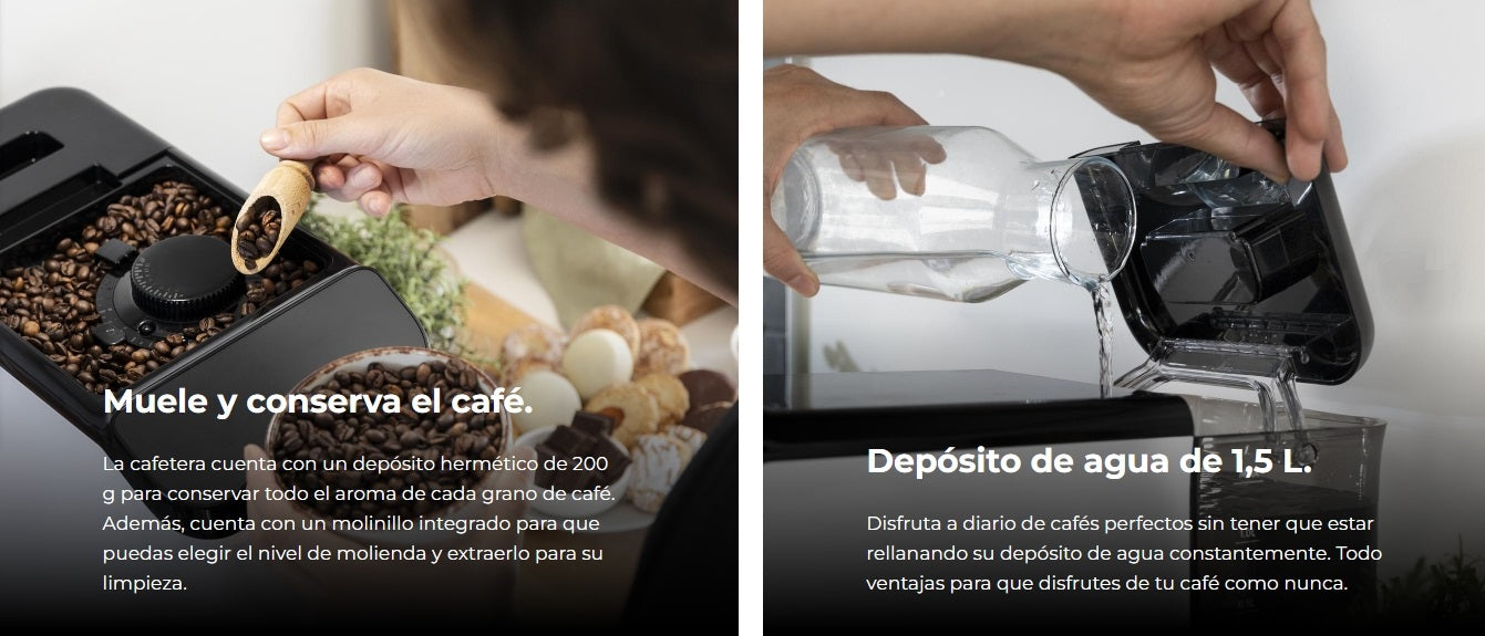 - Superautomática, súper compacta: la cafetera cuenta con un diseño compacto que prepara expresos y americanos de café en grano recién molido con la misma eficacia que el resto de superautomáticas.