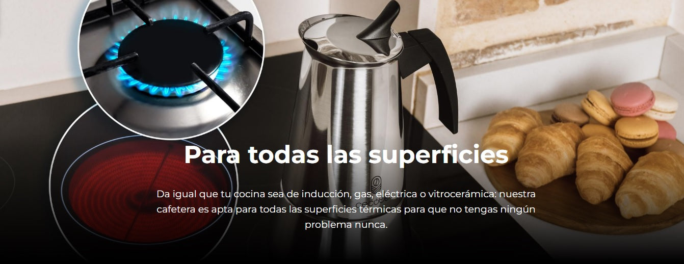Para todas las superficies: consigue tu espresso perfecto en cualquier superficie térmica, ya sea en una cocina de inducción, de gas, eléctrica o en una vitrocerámica.
