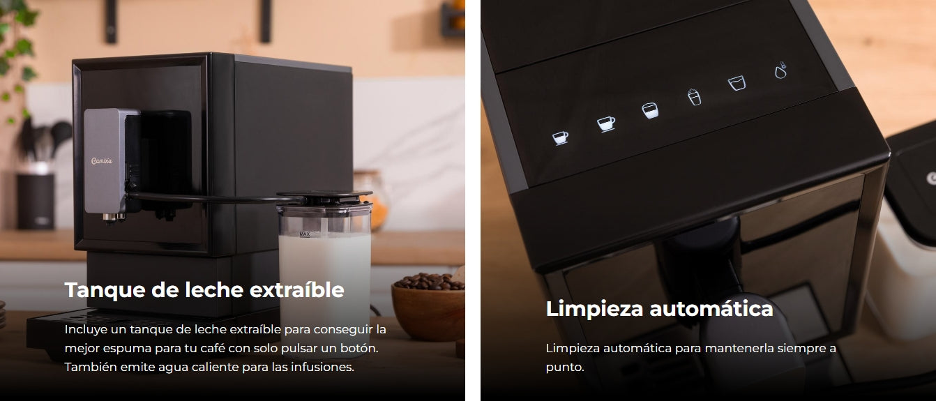 - Incluye un tanque de leche extraíble para conseguir la mejor espuma para tu café con solo pulsar un botón. También emite agua caliente para las infusiones.