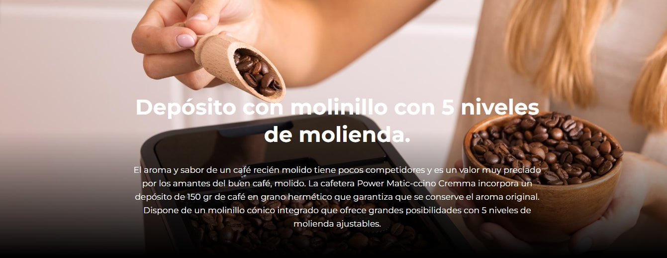 Cafetera superautomática Power Matic-ccino Cremma para los amantes del café recién molido. Dispone de un sistema de rápido calentamiento por thermoblock, con 19 bares y tanque de leche para tus capuccinos.